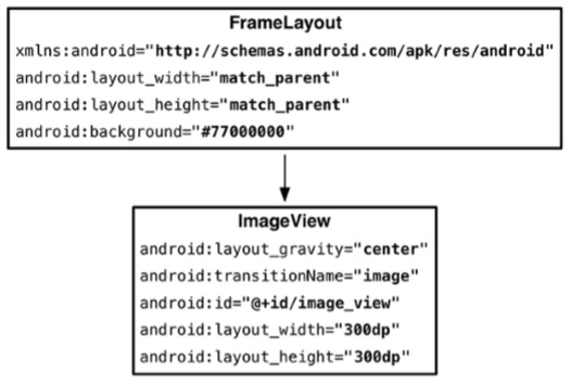 對于兩個展示相同元素的視圖,其間的任何動畫切換場景都可以使用shared element transition 來實現。圖1中,右邊的大圖片和左邊的小圖片是同一張圖。這張圖就是個shared element。