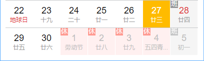 ? ? ? ?一、放假時間:2019年5月1日(星期三)至2019年5月4日(星期六),共放假4天。4月28日(星期日)、5月5日(星期日)正常上班,如下圖所示: