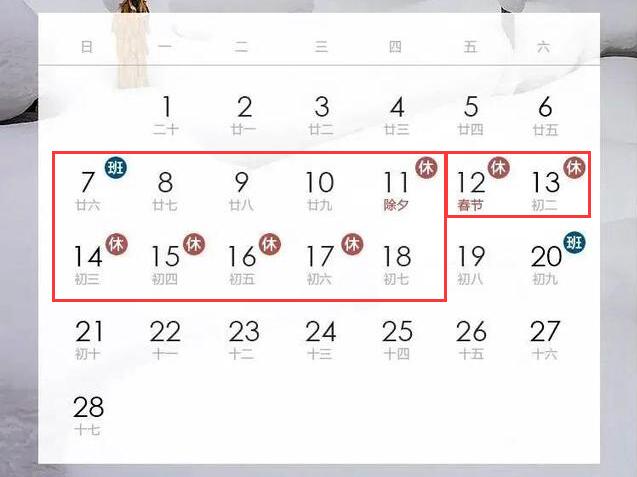 ? ? ? ?一、春節(jié)放假時間:2021年2月7日(農(nóng)歷臘月二十六)至2021年2月18日(農(nóng)歷正月初七)放假,共12天,2月19日(星期五)開始上班,2月21日(星期日)正常上班,如下圖所示。