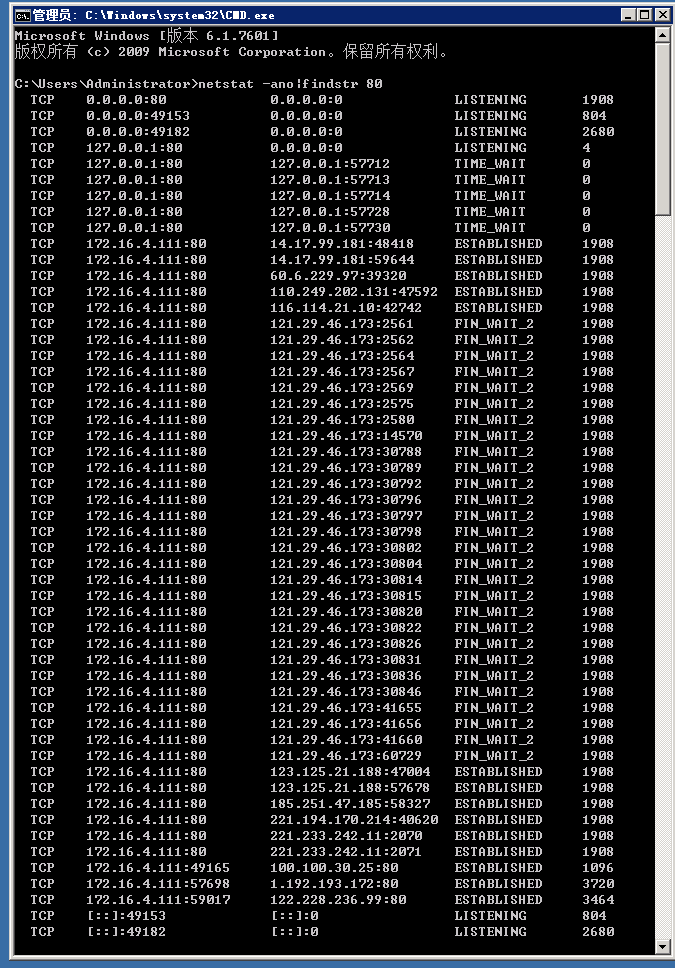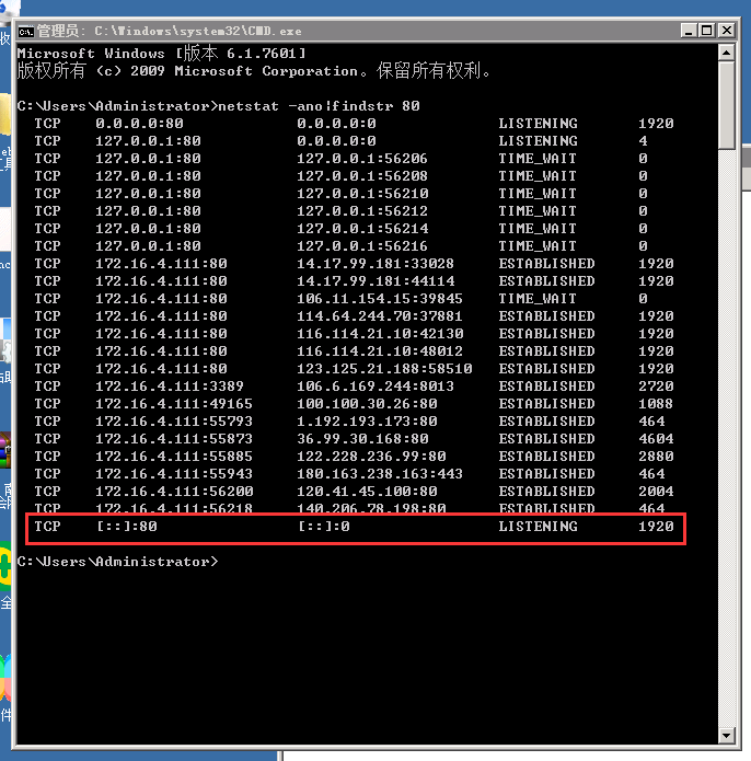 服務器內命令提示符中使用命令:netstat -ano|findstr 80